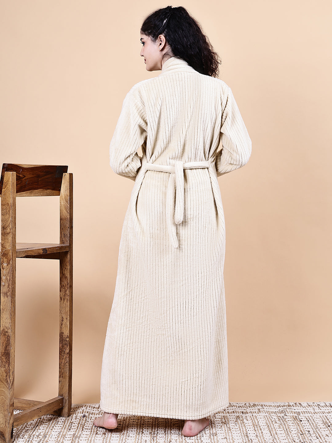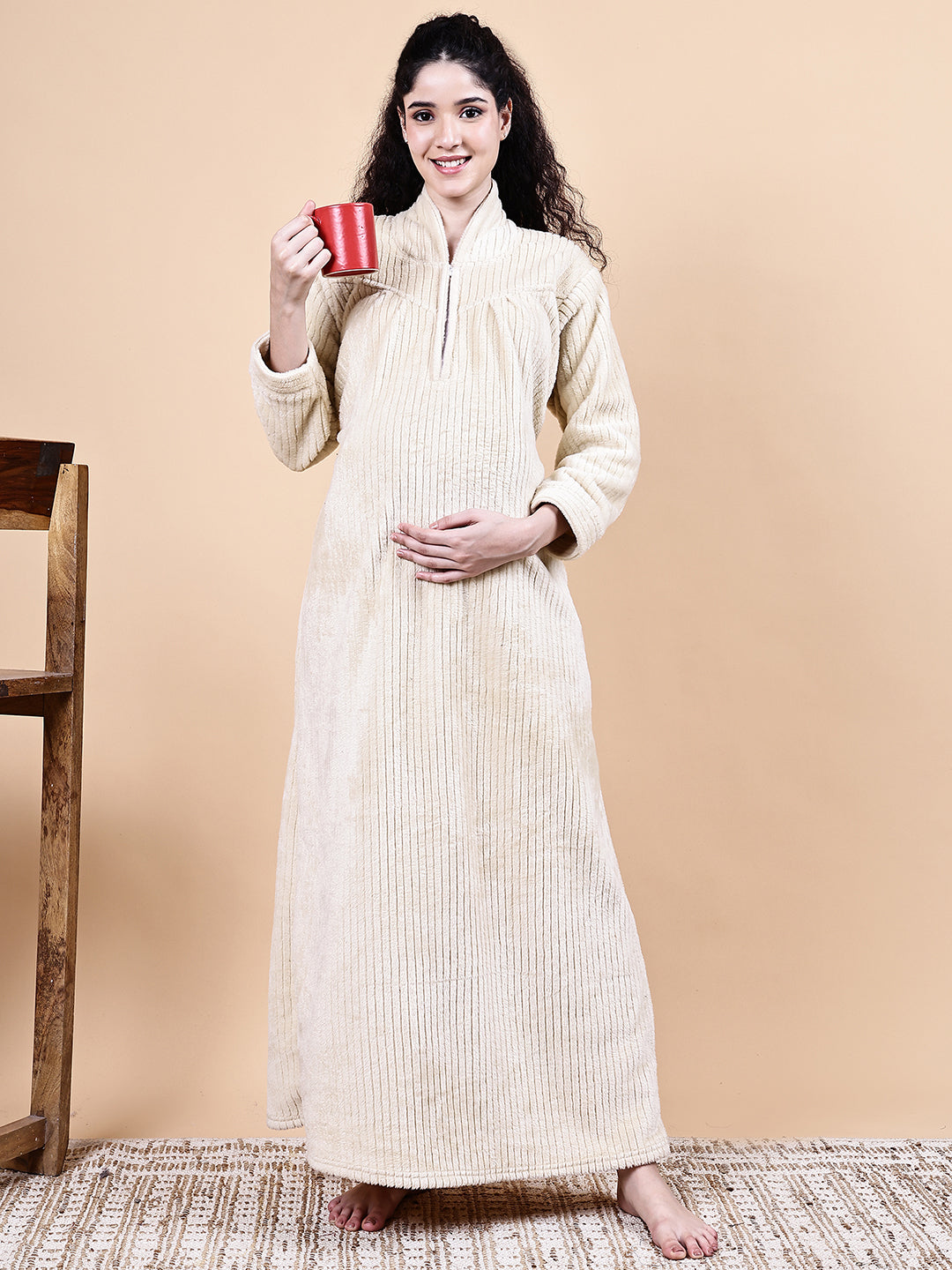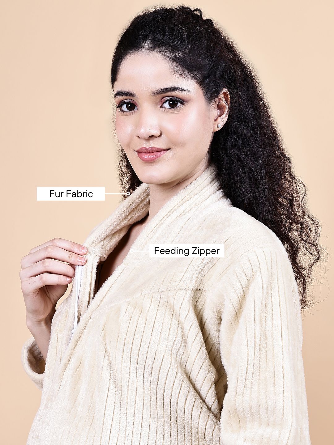 Secret Wish Cream Solid Fur Winter Maternity & Feeding Nighty is crafted from soft fur fabric to keep you warm, cozy, and comfortable during and after pregnancy. This full-length pregnancy nightwear features a collar neck, full sleeves, and an adjustable tie-up belt at the back for a custom fit. Designed with a front zipper for easy and convenient breastfeeding access, ideal for new moms. Perfect as a winter maternity nightdress, pregnancy sleepwear, loungewear or nursing nighty.