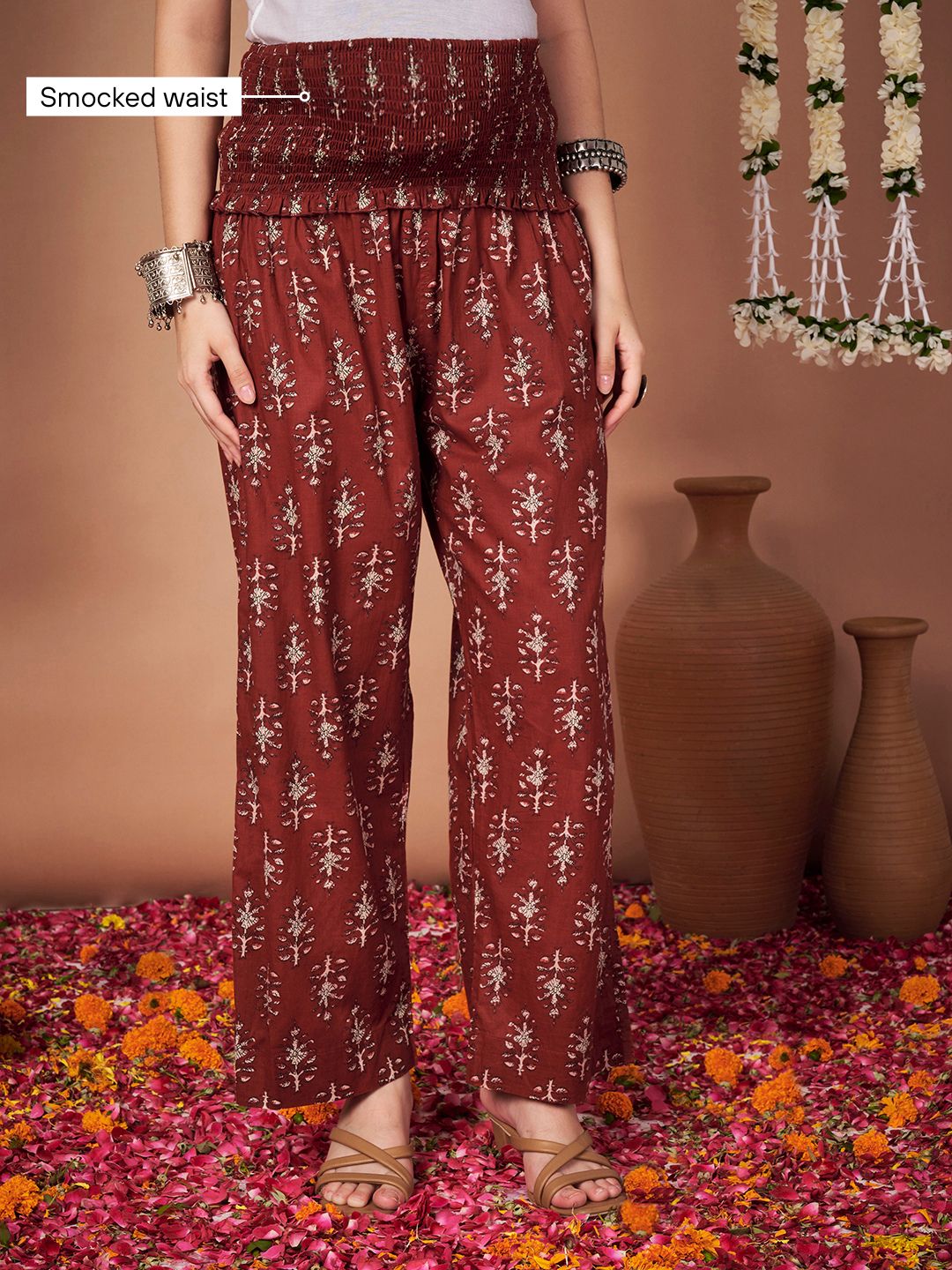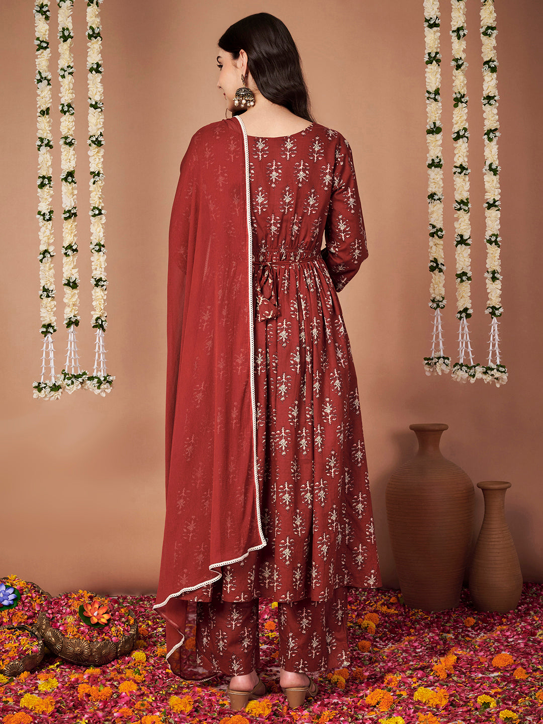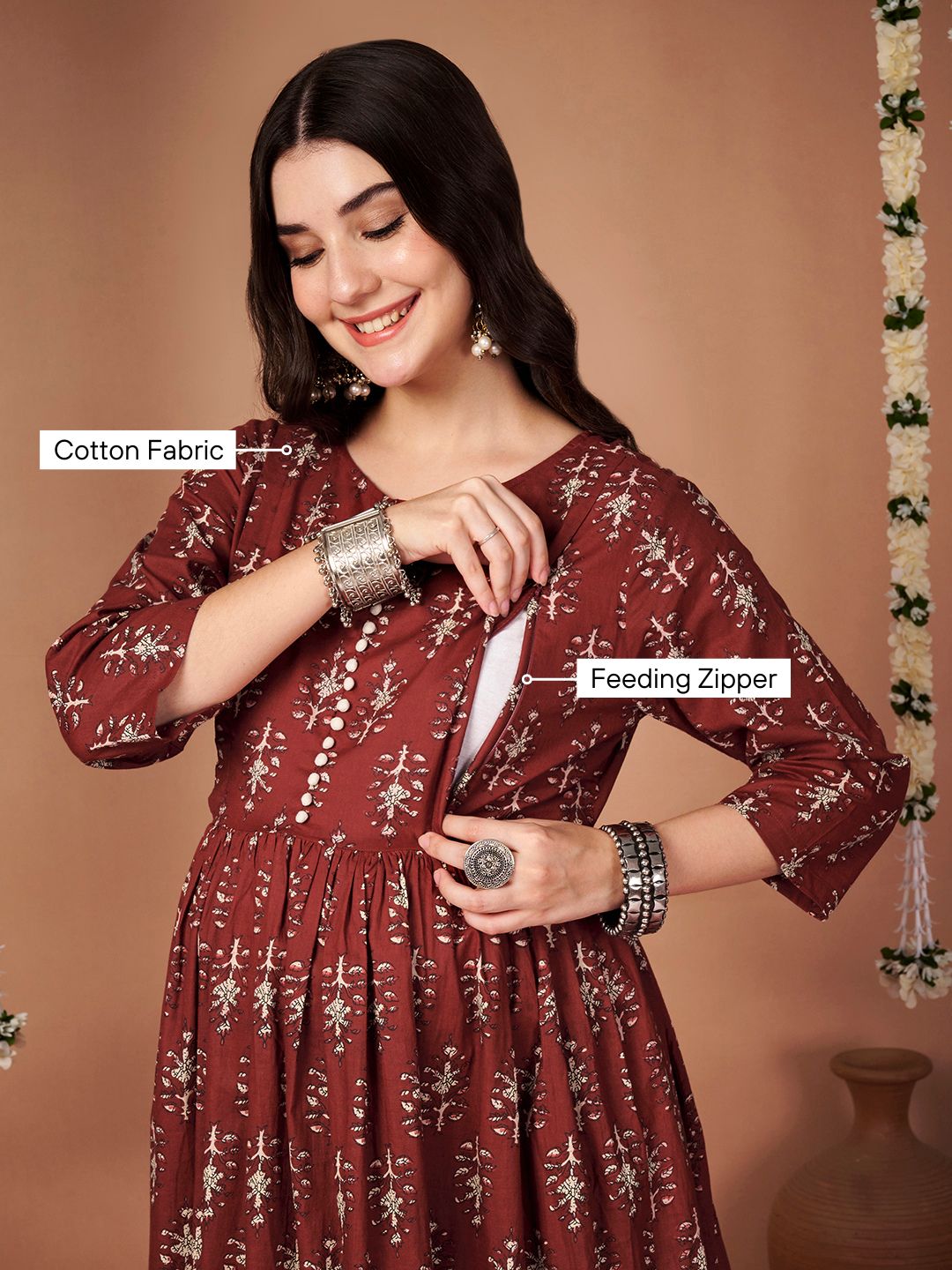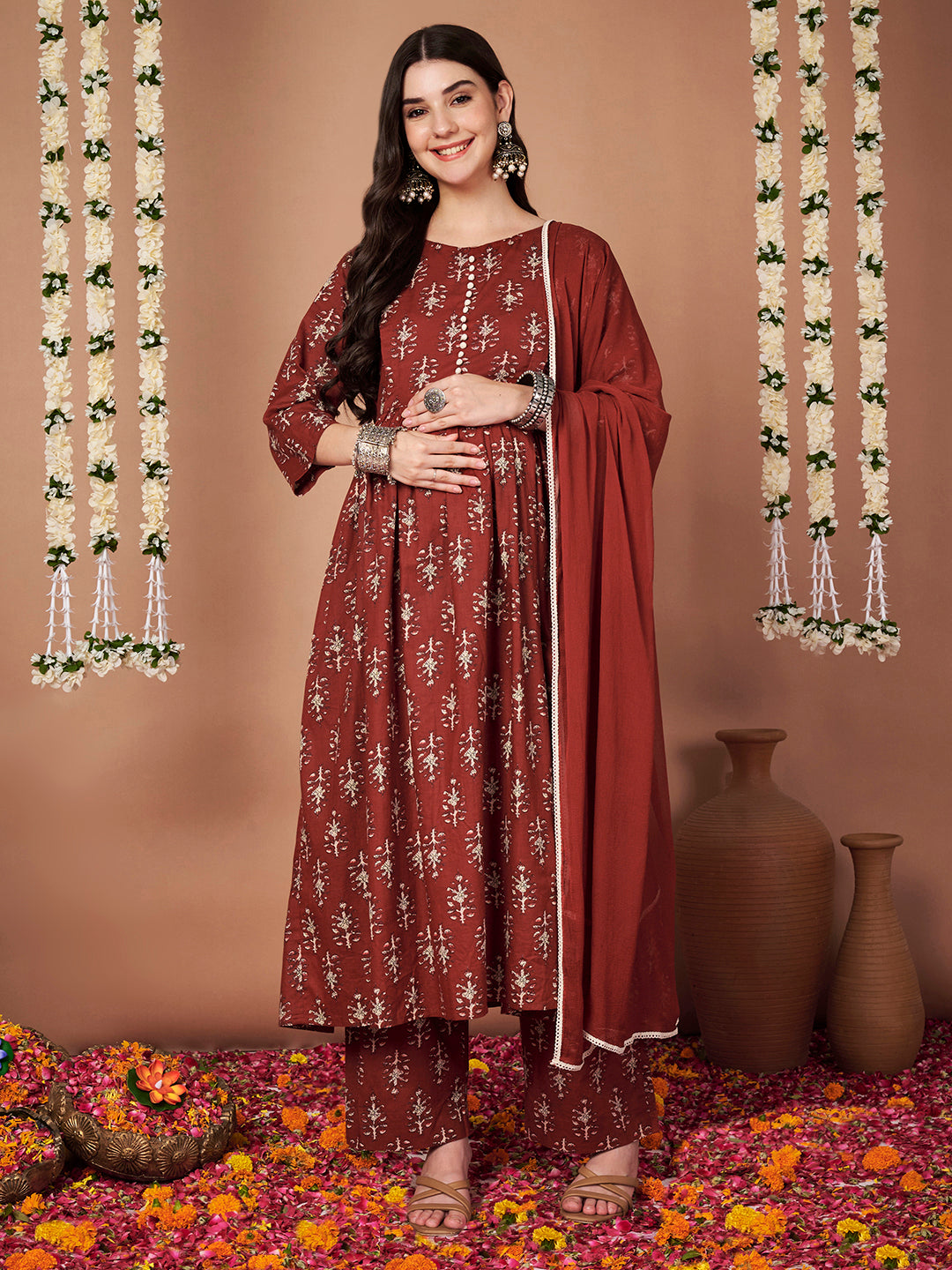 Rust Ikkat Floral Print Cotton Maternity Kurta with Trouser and Dupatta