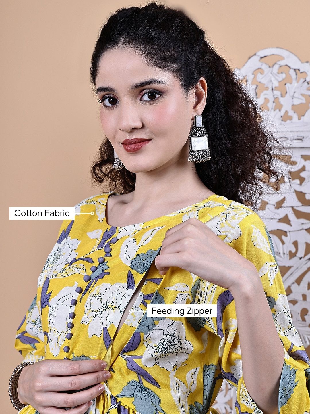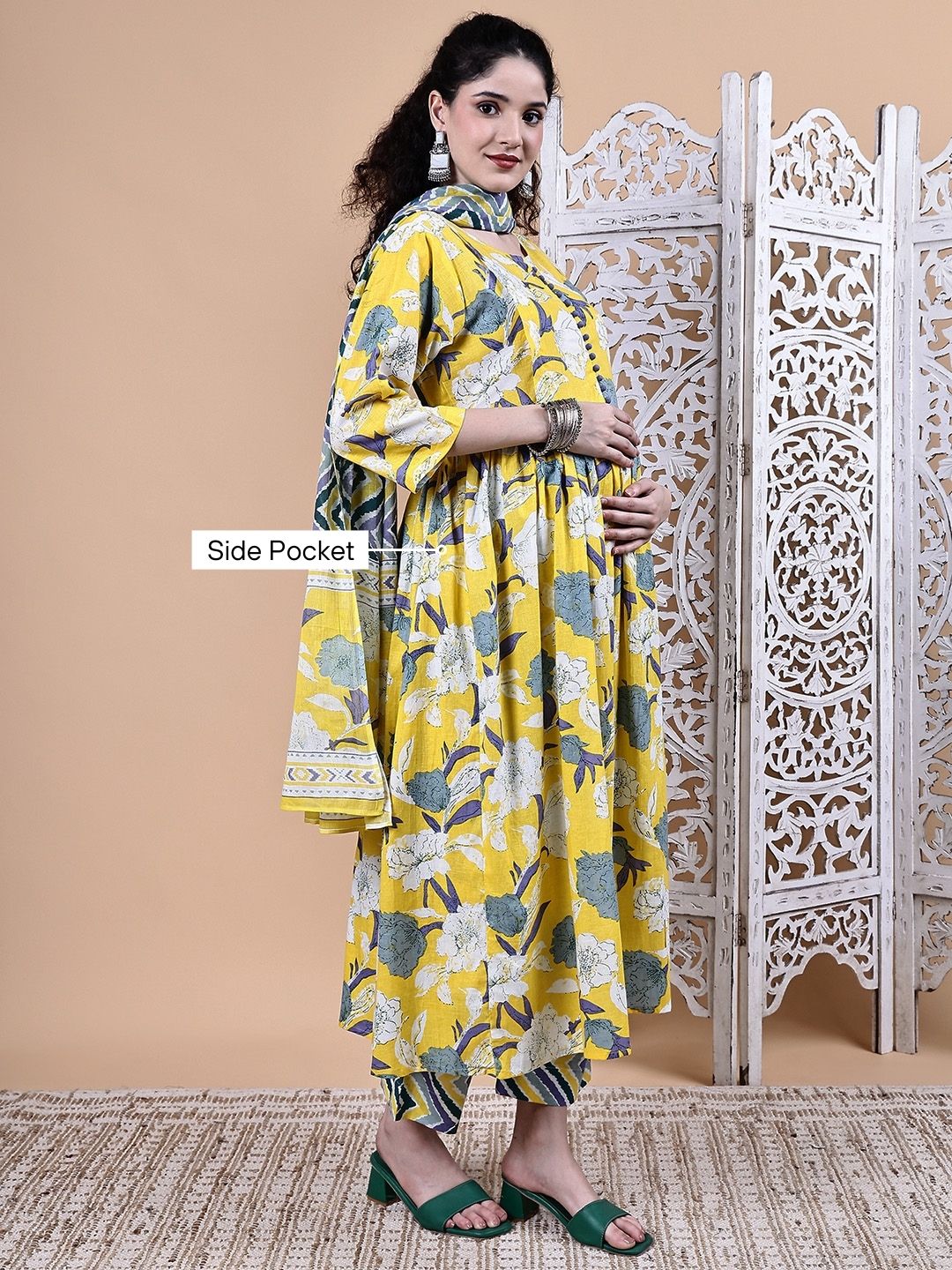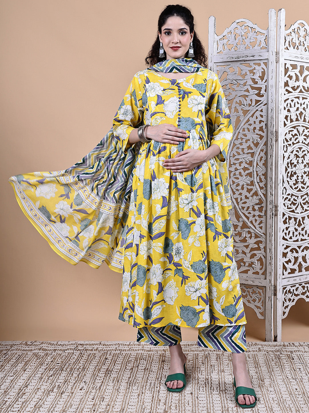 Yellow Floral Cotton Maternity Kurta with Trouser and Dupatta