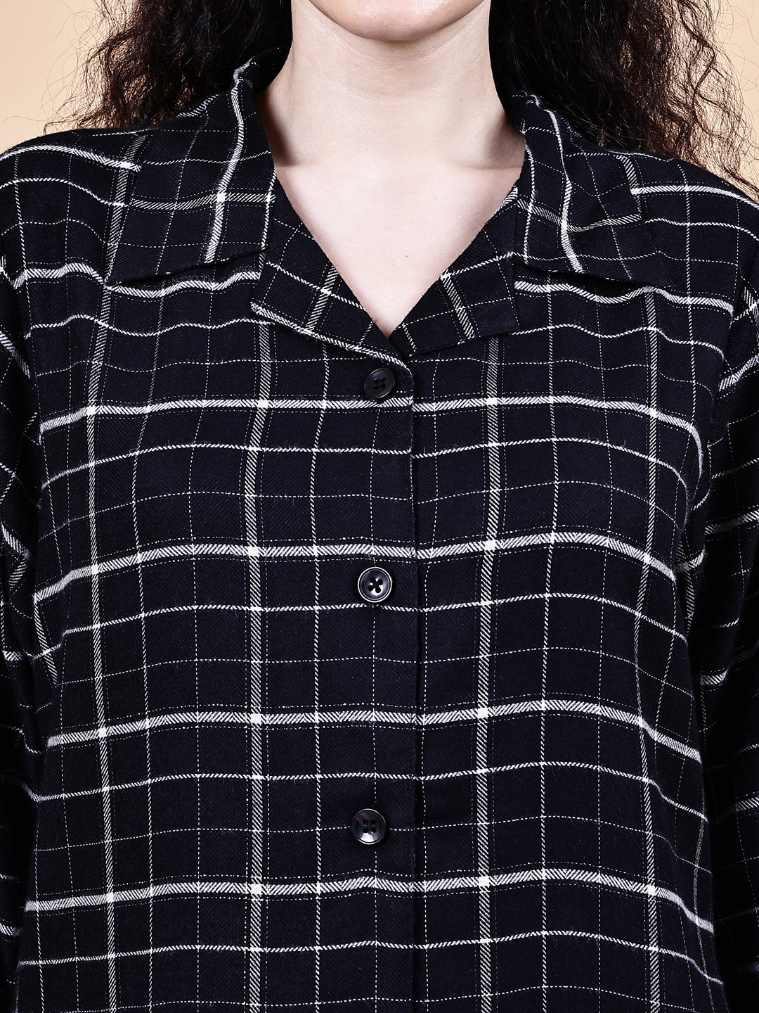 Secret Wish Black Checkered Flannel Night Suit is crafted from soft and breathable flannel fabric. The button-down full-sleeve shirt features a smart notch collar for a relaxed fit, while the straight-fit trousers come with an elasticated waistband and drawstring closure for adjustability, along with side pockets for added convenience. Perfect for lounging at home, casual evenings or sleepwear, this stylish flannel night suit combines functionality with effortless style.