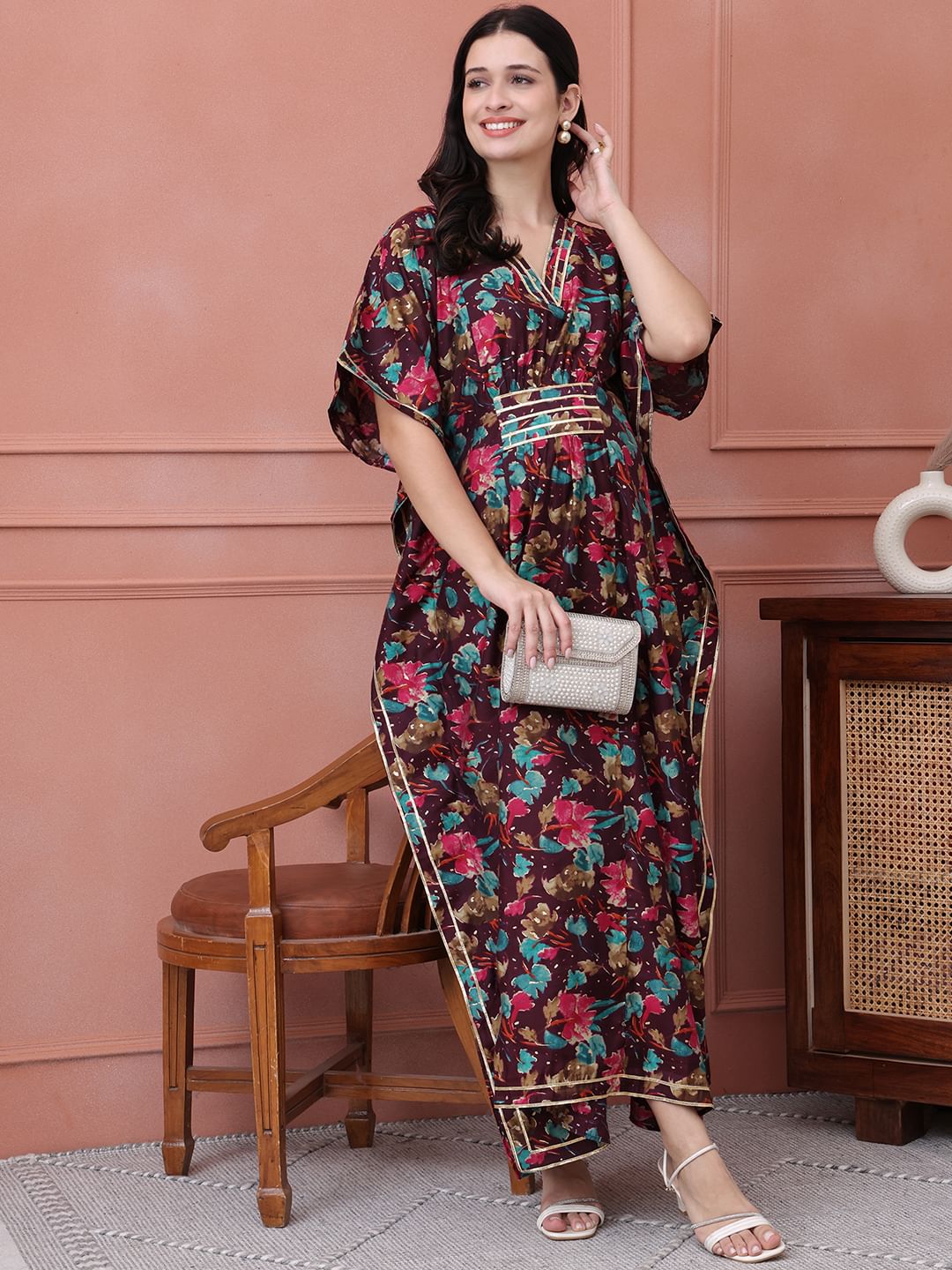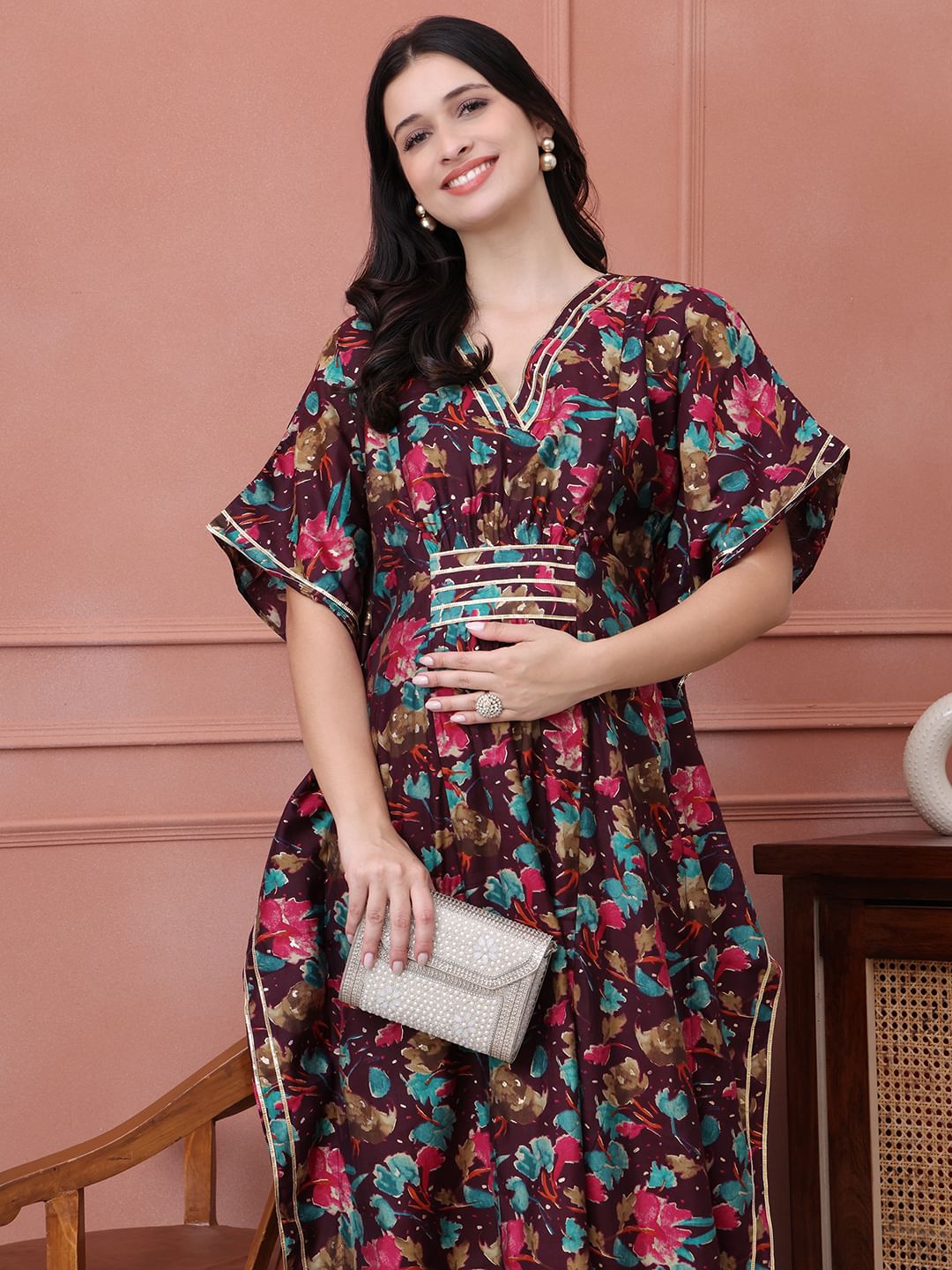 Floral Purple Chanderi Silk Maternity Kaftan Dress