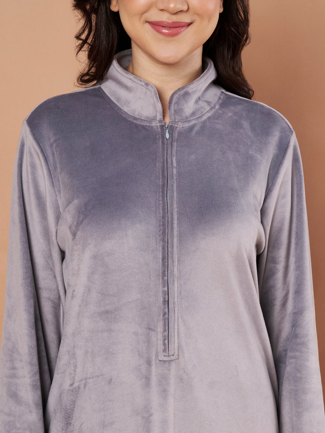 Grey Solid Velvet Winter Nighty