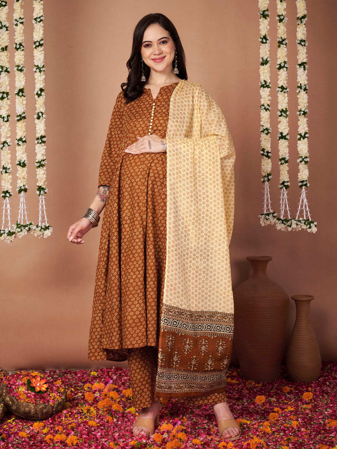 Mustard Floral Cotton Maternity Kurta with Trouser and Dupatta