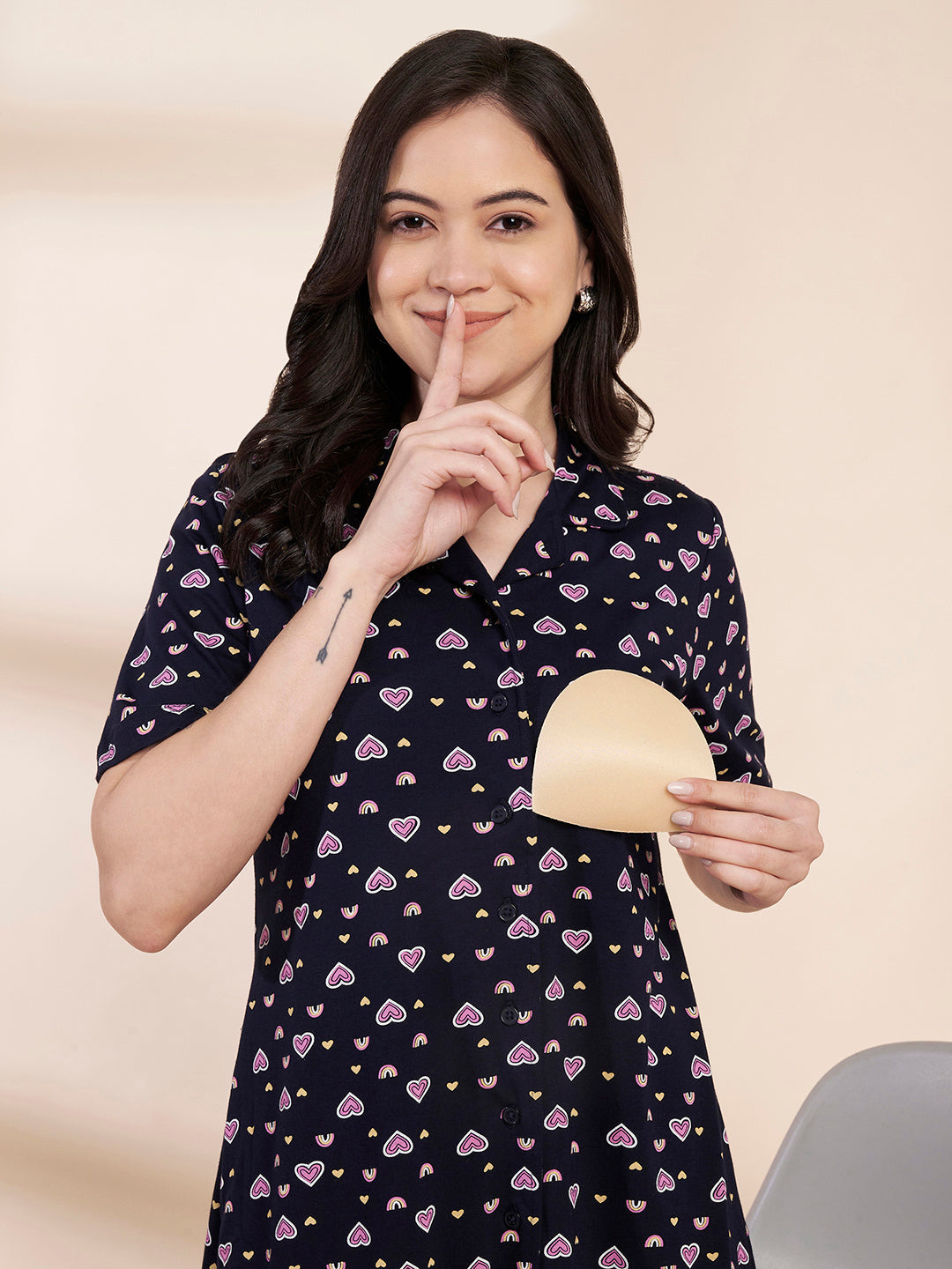 Navy Blue Heart Print Hosiery Padded Nighty