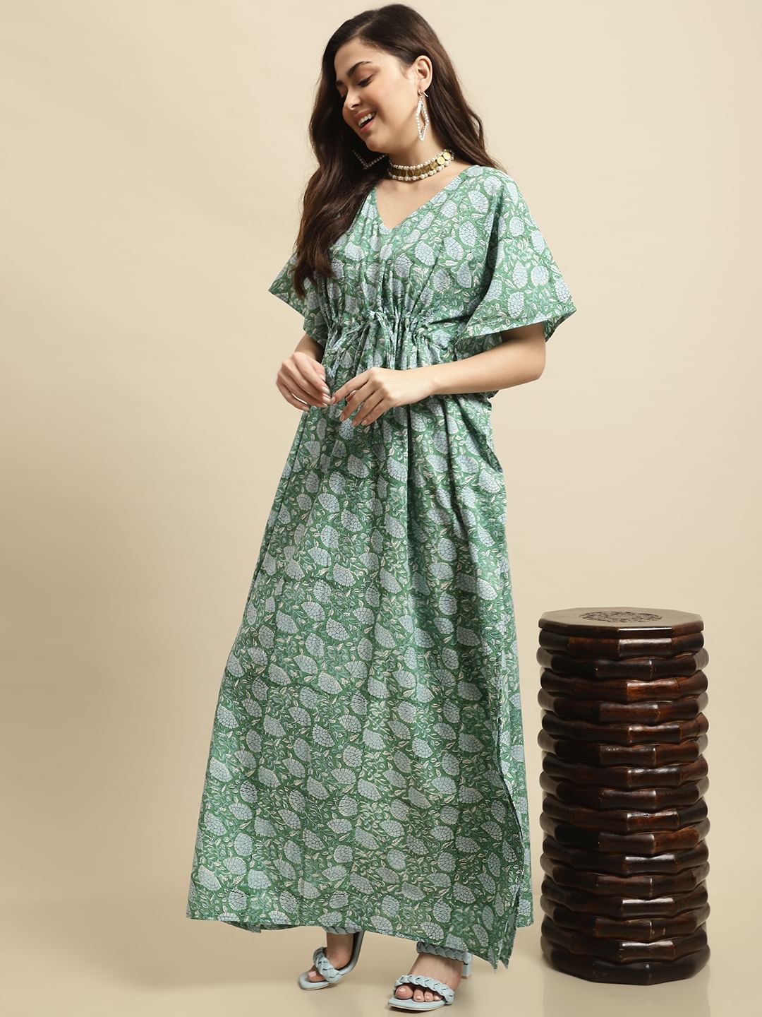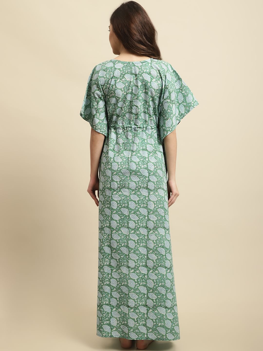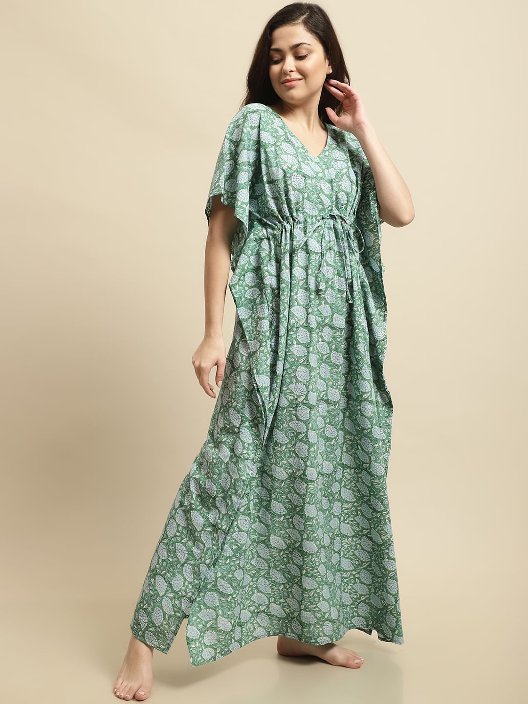 Green Sanganeri Handblock Print Kaftan Night Dress