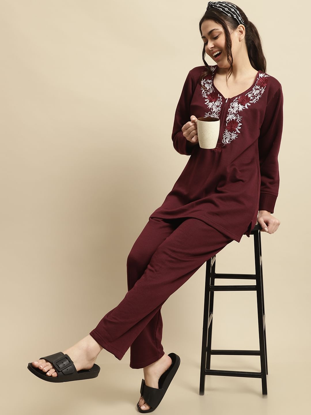 Purple Solid Woolen Night Suit Set of Short Kurta with Front Zipper and Pyjamas