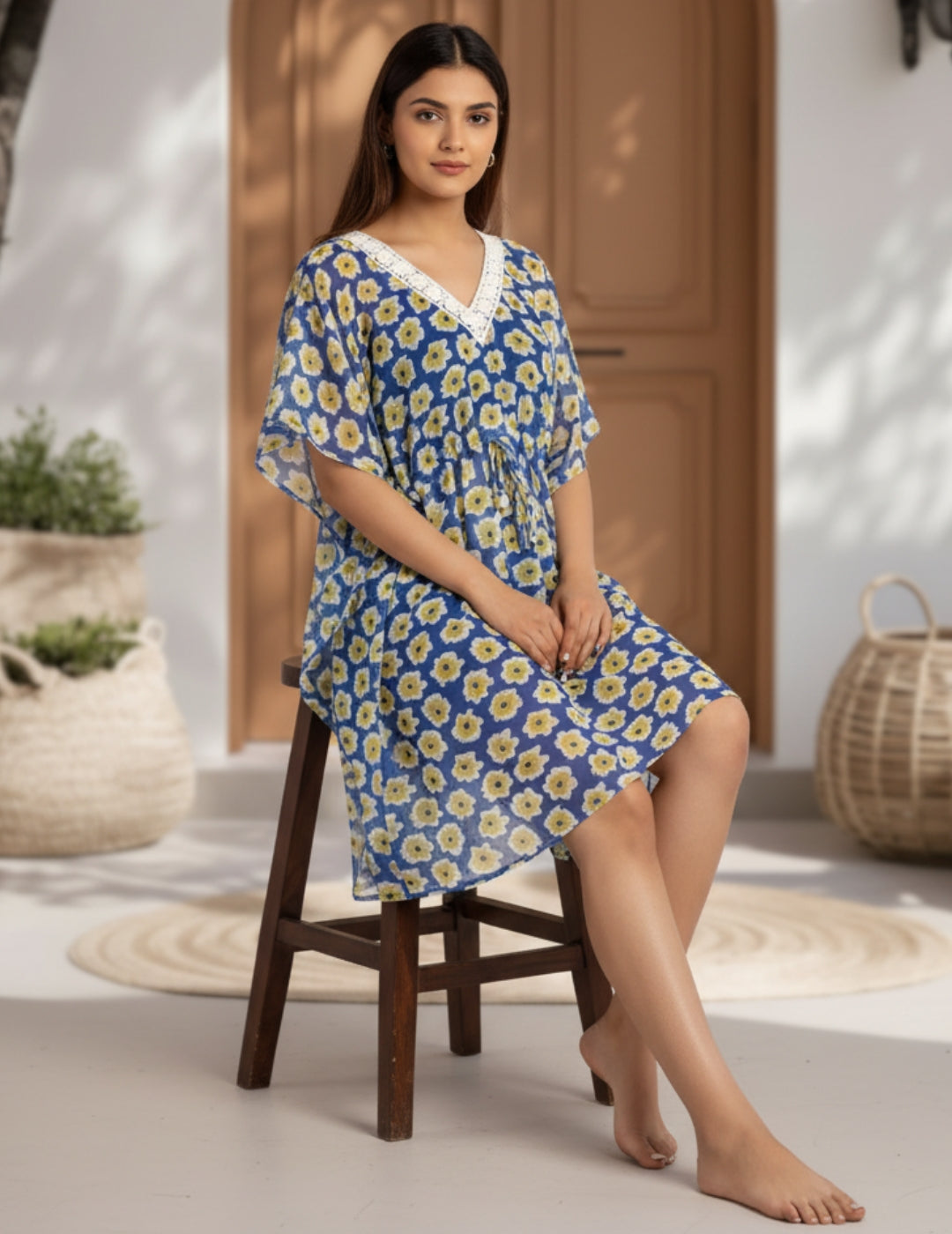 White and Blue Floral Swimwear Cover Up Kaftan